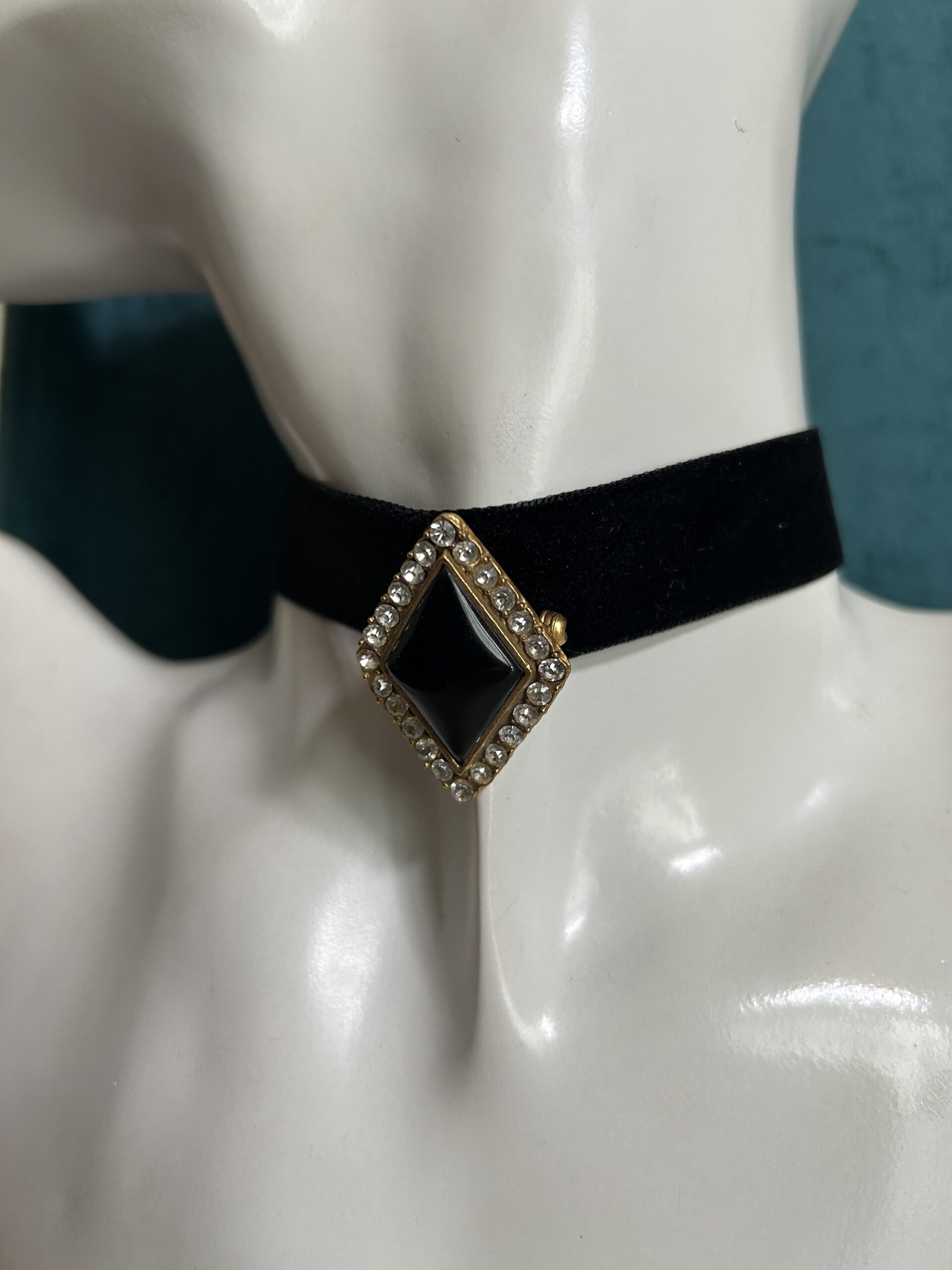 Choker in velluto con chiusura in acciaio inossidabile con spilla originale vintage con Swarovski e pietra in resina nera.