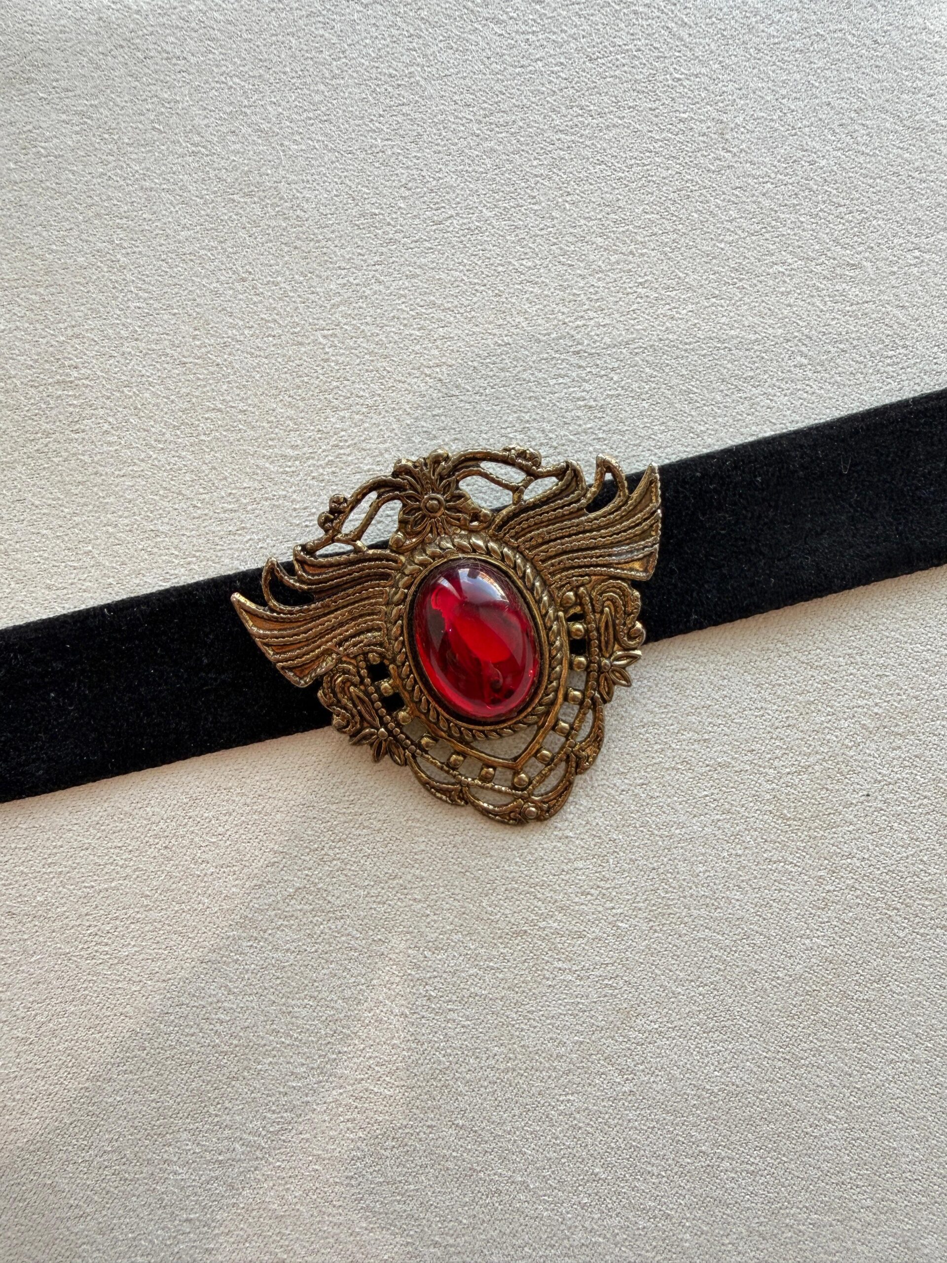 Choker in velluto con chiusura in acciaio inossidabile con spilla originale vintage con pietra in resina rossa