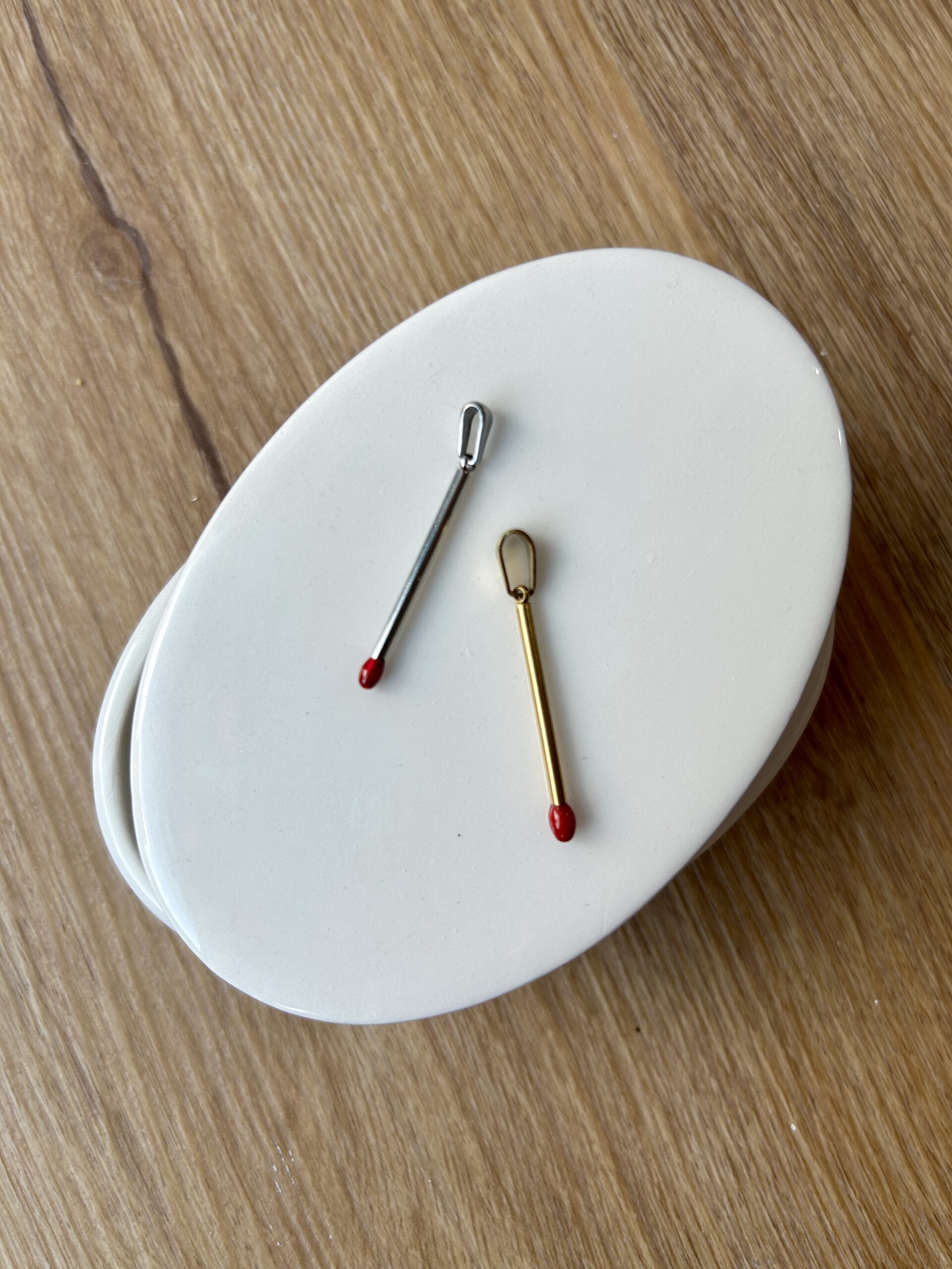 Questo ciondolo a forma di fiammifero in acciaio inossidabile è stato smaltato con una punta rosso vivo che sembra pronta ad accendersi da un momento all’altro.