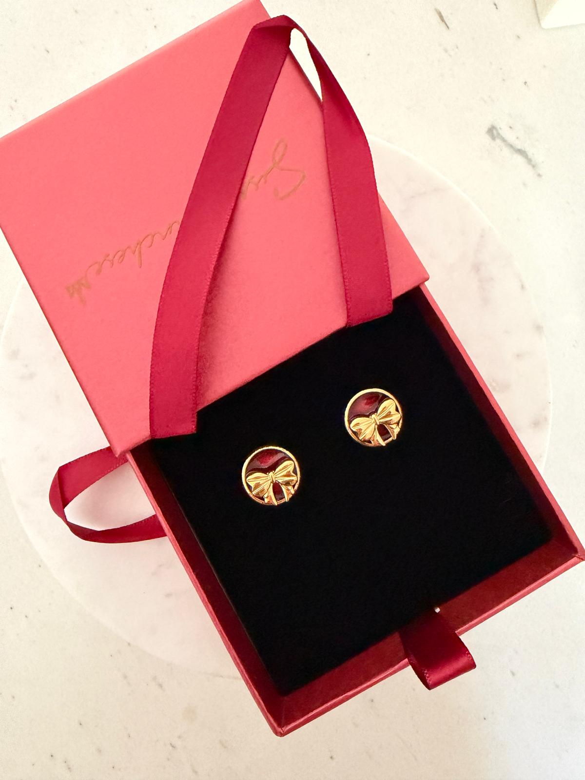 Questi orecchini artigianali uniscono la lucentezza intramontabile della galvanica in oro 24 kt al calore avvolgente della resina rossa, colata a mano per creare un effetto profondo e luminoso.