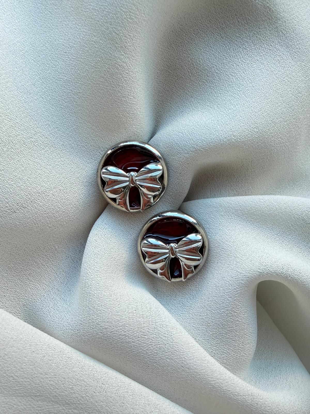 Il design rotondo è impreziosito da un delicato fiocco in rilievo, simbolo di eleganza e femminilità, che risalta in modo raffinato sulla base rosso rubino. La cornice in ottone avvolge la resina come un gioiello vintage, dando vita a un accessorio dal fascino senza tempo.