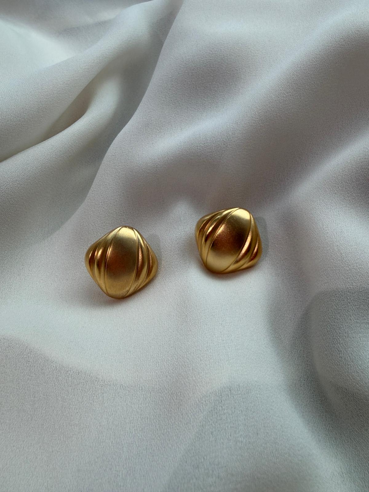 Questi orecchini dal design vintage sono realizzati in ottone, disponibile sia con finitura dorata che argentata. Presentano una superficie modellata da volute geometriche, tipica dello stile scultoreo degli anni ’80-’90, che valorizza la luce grazie alle lavorazioni opache e satinate.