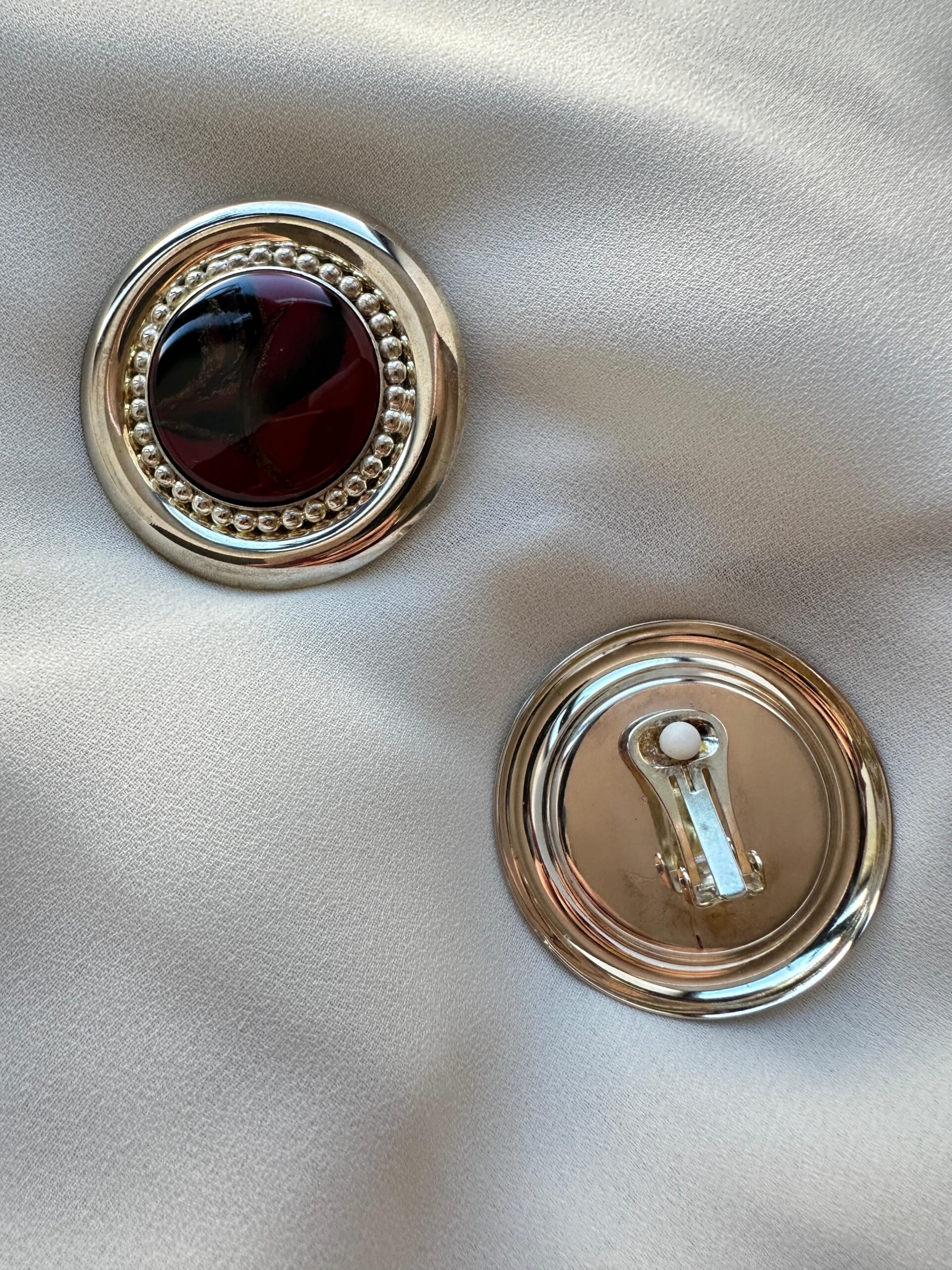 Orecchini bottone con galvanica arg. e con pietra in resina bordeaux e nero (clips)