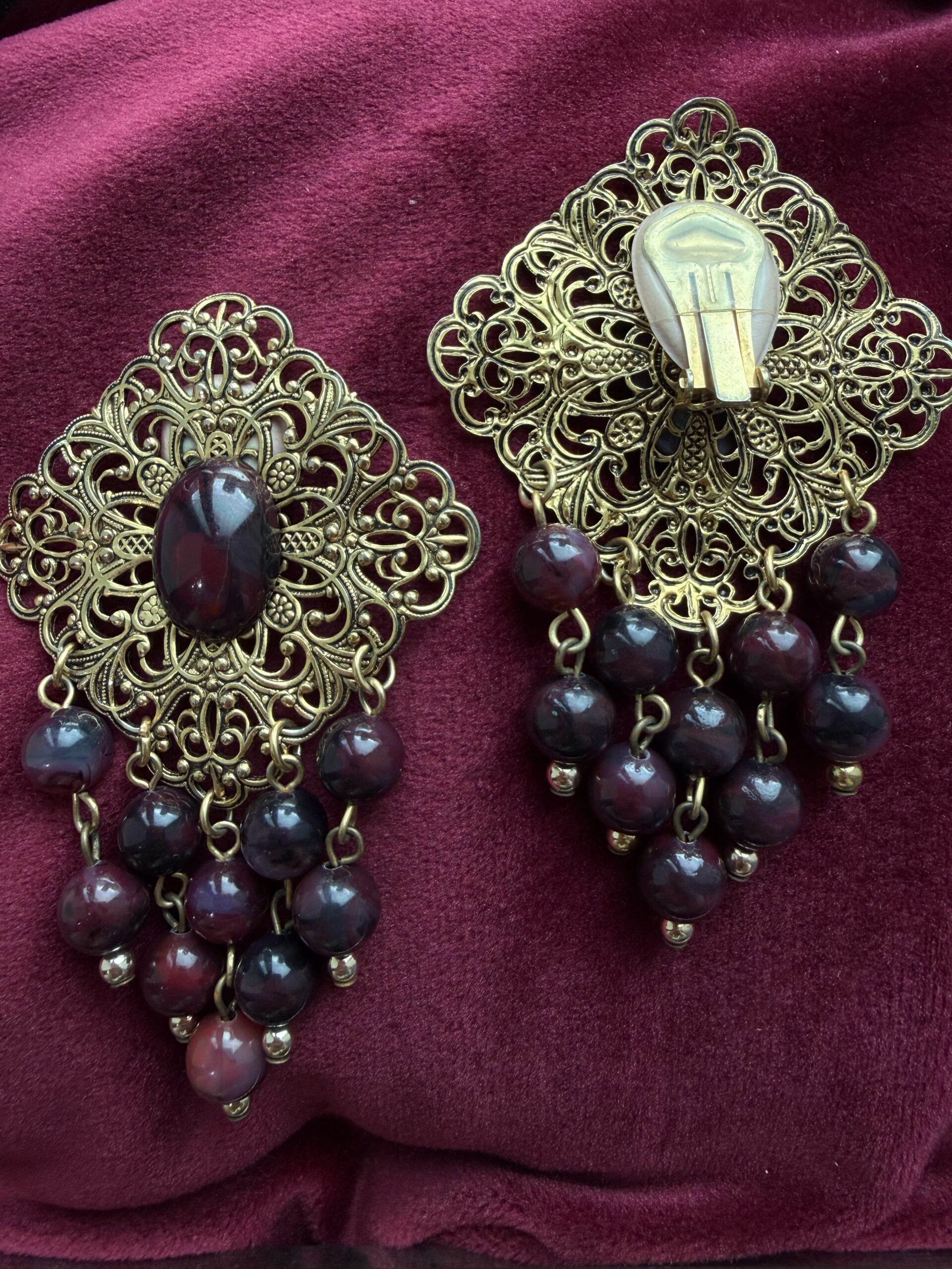 Orecchini pendenti in ottone con clips con perline in resina bordeaux